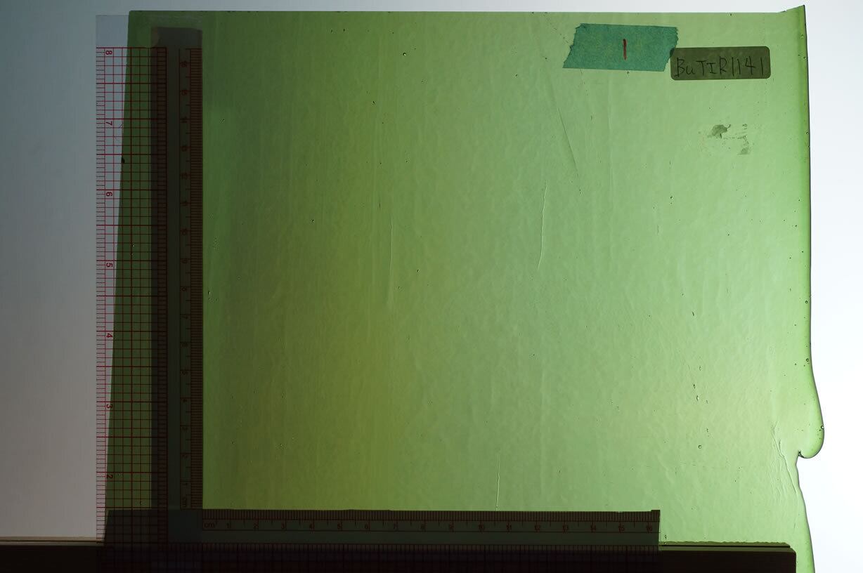 ◆イリディセントは光沢を生かしたデザインに使うほか、膜面側は離型剤がほとんど食いつかないのでファイバーペーパーなどを使う場合のベースガラスに最適です
